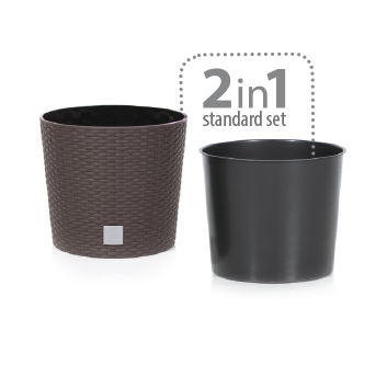 Wymiary:Średnica górna – 30 cmŚrednica dolna – 25,2 cmWysokość – 27 cmGłębokość wkładu – 24,2 cmWymiar wewnętrzny wkładu – 28,2 cmPojemność wkładu – 15lPojemność donicy – 15,3lWykonanie / powierzchnia:Tworzywo (plastik) / Wzór: RattanZastosowanie:do wewnątrzna zewnątrz Wysoka donica plastikowa wykonana na wzór rattanuDuża odporność doniczki na mróz i warunki atmosferyczneWysoka jakość wykonania doniczkiWkład w komplecieProsta okrągła doniczka z kolekcji Rato o fakturze przypominającej plecionkę z naturalnego rattanu. Funkcjonalna, o ciepłym, egzotycznym charakterze, stanowi doskonałe uzupełnienie stylowej dekoracji wnętrz, aranżacji tarasów, werandy, ogrodów zimowych, ogródków restauracyjnych, barowych oraz kawiarnianych. Insygnowana emblematem kolekcji RATO. W zestawie z donicą wkład.