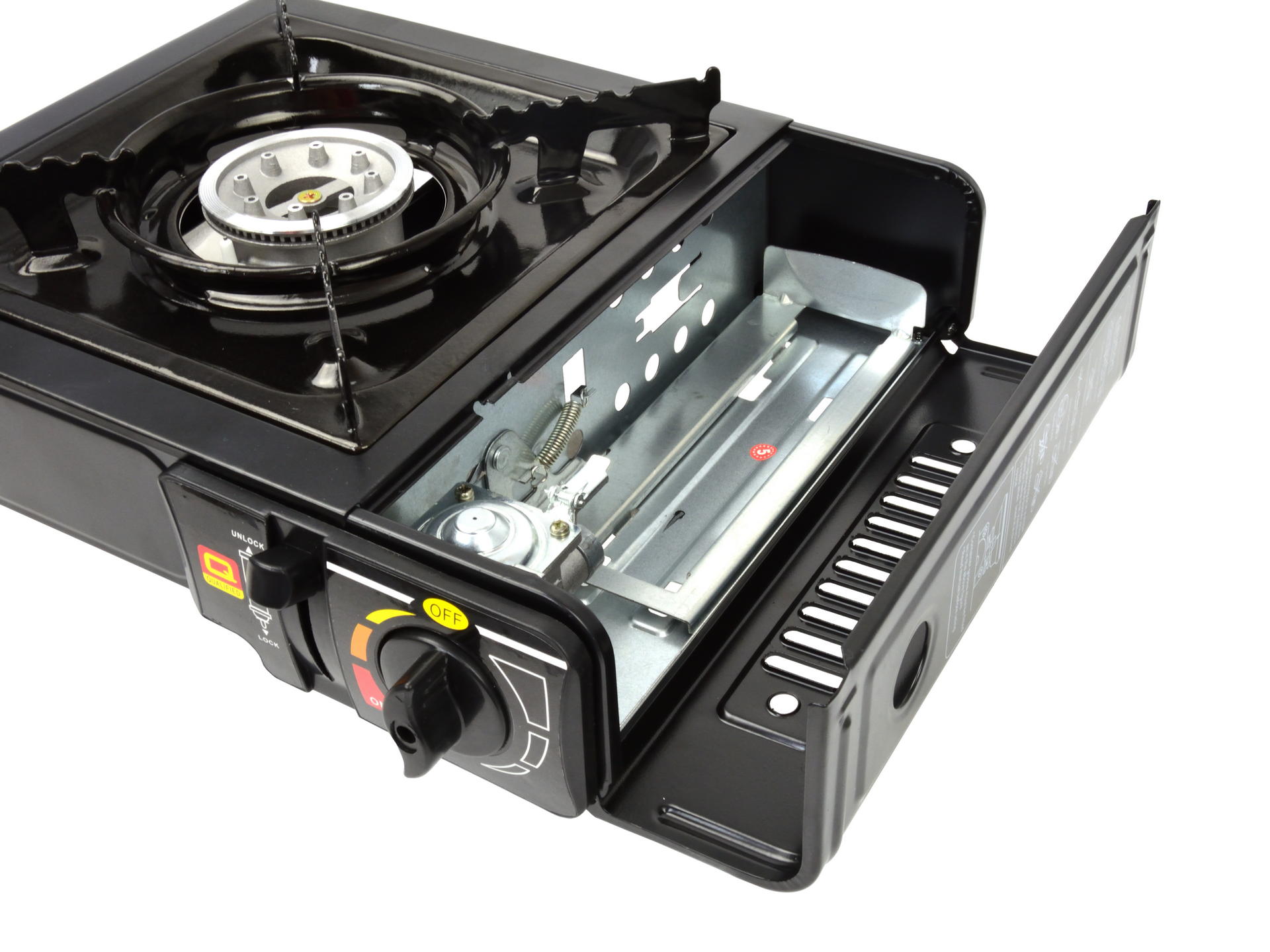Gazowa kuchenka turystyczna zasilana kartuszami + nadstawka do grillowaniaKuchenka zasilana kartuszami powszechnie stosowanymi w tego rodzaju urządzeniach. Wyposażona została w zapalnik piezoelektryczny, dzięki temu do uruchomienia kuchenki nie są potrzebne zapałki bądź zapalniczka. Palnik posiada dodatkowe wypustki zapewniające równomierne podgrzewanie powierzchni. Kuchenka posiada nadstawkę przeznaczoną do grillowania co sprawia że jest to idealne rozwiązanie podczas wypadów plenerowych, biwaków itp.Cechy produktu:zapłon piezoelektrycznypłynna regulacja płomieniamoc grzewcza na poziomie 2,5 kWzasilana standardowymi nabojami gazowymi (kartuszami)osłona płomienia przed podmuchami wiatrudodatkowa nadstawka do grillowania niezastąpiona podczas wypadów plenerowychSpecyfikacja techniczna:Zasilanie: gaz butanŚrednica iglicy zaworu: 0,55 mmZużycie gazu: 195 g/hCiśnienie zasilające: 3,5 – 6,5 barMoc grzewcza: 2,5 kWWymiary: 34,5x28x11 cm