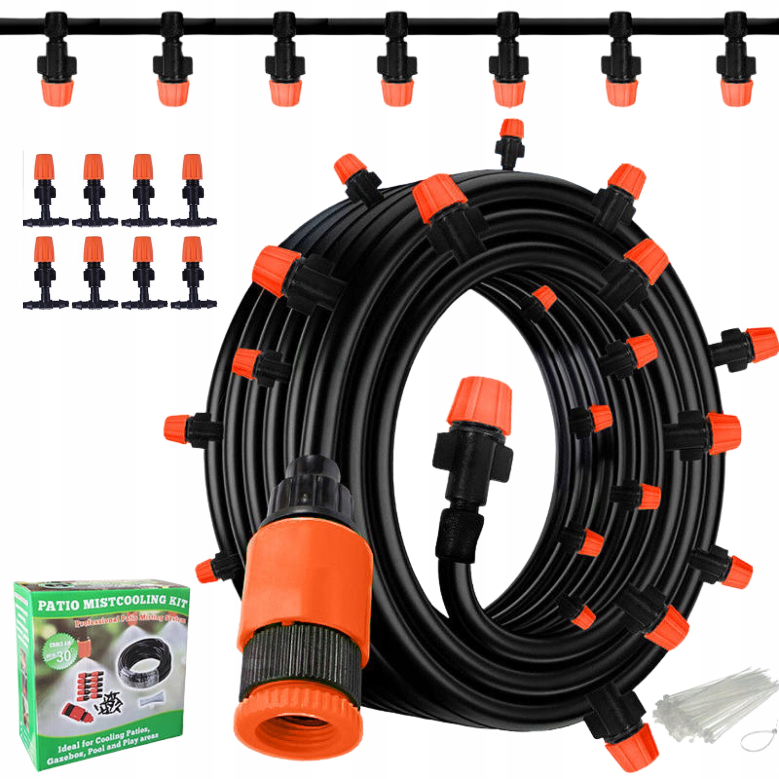 KURTYNA WODNA MGIEŁKA SYSTEM NAWADNIANIA ZRASZACZ OGRODOWA WĄŻ DŁUGI 20mKurtyna wodna to doskonały sposób na orzeźwienie w gorące dni. Umieszczona strategicznie, na przykład pod zadaszeniem na tarasie lub pod parasolem, skutecznie obniża temperaturę otoczenia nawet o 10-12 stopni Celsjusza.Ponadto, mgiełka wodna pełni również inne funkcje. Usuwa zanieczyszczenia z powietrza i odstrasza latające owady, co sprawia, że pobyt na świeżym powietrzu staje się jeszcze przyjemniejszy i bardziej komfortowy.Świetnie nadaje się jako system nawadniania roślin!Długość: 20M System nawadniania roślinŚwietnie sprawdzi się również do nawadniania roślin. Dzięki regulowanemu stopniowi rozpylanej mgiełki możemy skutecznie podlać wszystkie nasze rośliny np. w tunelu ogrodowym.Wystarczy podłączyć kabel z wodą i system nawadniania automatycznie uruchomi się i rozpocznie zraszanie. Nie zużywa energii elektrycznej. UNIWERSALNE ZASTOSOWANIE✅ Zraszanie tuneli ogrodowych✅ Nawadnianie ogródków✅ Zraszanie kwiatów✅ Podlewanie roślin doniczkowych✅ Mgiełka do zraszania trawnika✅ Mgiełka dla zwierzątSPECYFIKACJA TECHNICZNA:✅ Wysoka jakość wykonania✅ Uniwersalne zastosowanie✅ Regulowane dysze✅ Długość: 20M✅ Ilość dysz: 20 (rozmieszczone co 1m)✅ Kolor: czarno-pomarańczowy ZESTAW ZAWIERA:☑️ Fabrycznie nową kurtynę wodną☑️ 1x szybkozłączkę☑️ 15x opaska zaciskowa☑️ Oryginalne opakowanie