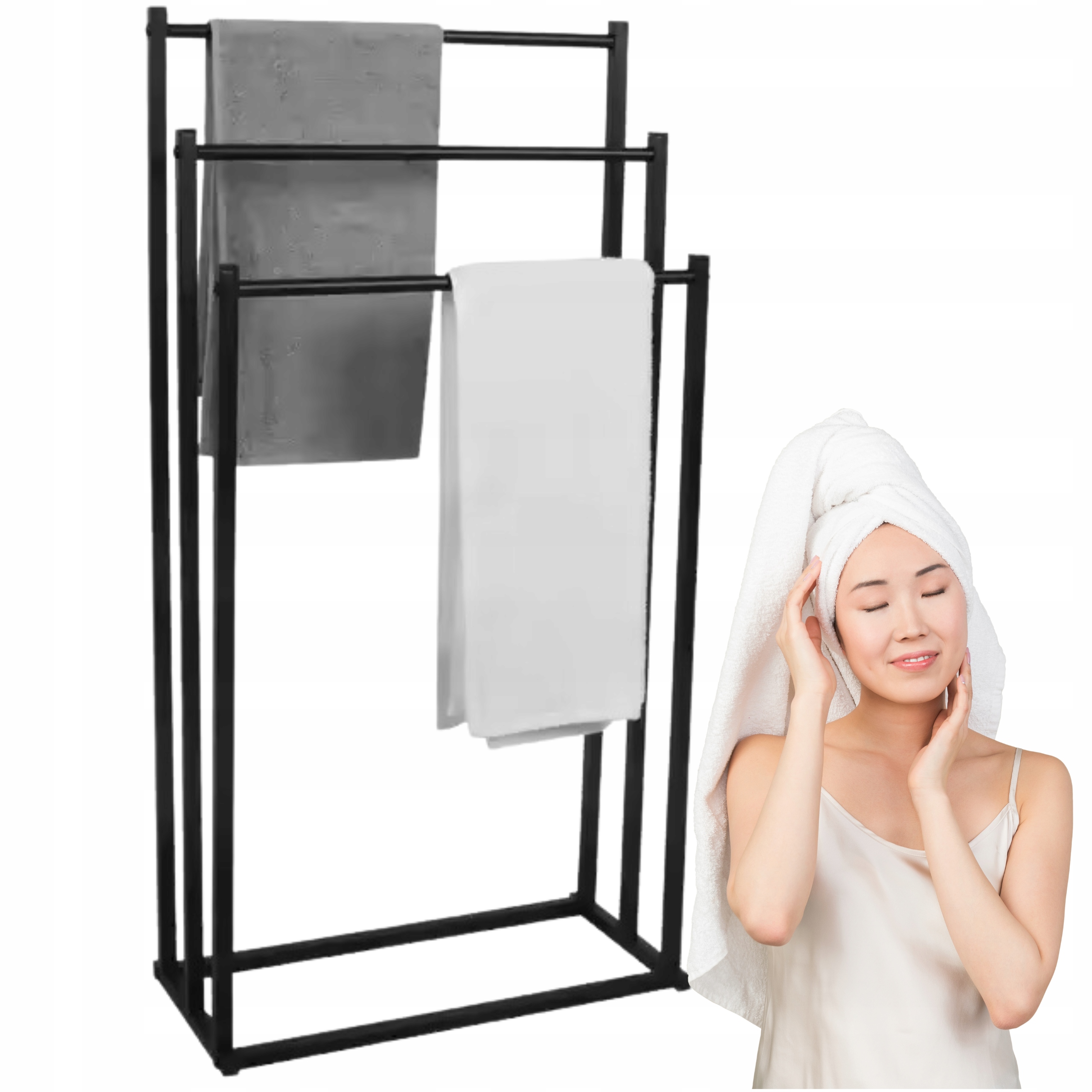 STOJAK WIESZAK NA RĘCZNIKI CZARNY WIESZAK STOJĄCY PODŁOGOWY ŁAZIENKOWY LOFTWolnostojący wieszak na ręczniki to doskonałe rozwiązanie do Twojej łazienki.Trzy ramiona pozwalają na zawieszenie większej liczby ręczników. Nasz stojak wykonany jest z najwyższej jakości metalu malowanego proszkowo, co zapewnia trwałość i odporność na wilgoć.Jest łatwy do czyszczenia, a jego elegancki wygląd sprawia, że doskonale sprawdzi się nie tylko w łazience, ale również na balkonie, w salonie czy na tarasie!✅ Wysokiej Jakości Materiał: Metal malowany proszkowo, odporny na korozję i uszkodzenia, zapewniający długą żywotność produktu.✅ Nowoczesny Design: Prosty i elegancki wygląd w klasycznym czarnym kolorze, który doskonale wpasuje się w każdą łazienkę.✅ Trwałość: Mocna konstrukcja gwarantująca stabilność i długowieczność.✅ Uniwersalność: Idealny do różnych wnętrz, zarówno nowoczesnych, jak i klasycznych. ⭐️ W zestawie:✅ 1 x Stojak Metalowy 3 ramienny Czarny✅ Śrubki montażowe✅ Instrukcja⭐️ Specyfikacja:✅ Wysokość najwyższego ramienia: 84 cm✅ Wysokość średniego ramienia: 75 cm✅ Wysokość dolnego ramienia: 64 cm✅ Szerokość: 44 cm✅ Głębokość: 21 cm✅ Kolor: CzarnyGrubość profilu: 16 mmMontaż wieszaka jest bardzo prosty i zajmuje dosłownie 5 minut! ZALETY PRODUKTU✅ WOLNOSTOJĄCY – Możesz go umieścić w dowolnym miejscu łatwo i szybko, bez potrzeby demontowania czegokolwiek.✅ ELEGANCKI DESIGN – Jego estetyczny wygląd sprawia, że będzie eleganckim dodatkiem do Twojego mieszkania. Doskonale nadaje się nie tylko do łazienki, ale także na taras, do salonu czy na balkon.✅ WYTRZYMAŁOŚĆ – Wykonany z wysokiej jakości stali odpornej na rdzę i pokryty wytrzymałą farbą, co zapewnia długotrwałe użytkowanie bez obaw o uszkodzenia.✅ MONTAŻ – Łatwy do zamontowania, nie wymaga wiercenia w ścianach, dzięki czemu unikasz generowania pyłu w mieszkaniu.✅ WIELKOŚĆ – Trzy ramiona umożliwiają powieszenie co najmniej trzech ręczników różnej długości oraz innych przedmiotów, takich jak wilgotne stroje kąpielowe, koszulki czy spodnie.✅ ŁATWY W CZYSZCZENIU – Wystarczy przetrzeć stojak wilgotną szmatką, aby go szybko i łatwo oczyścić!