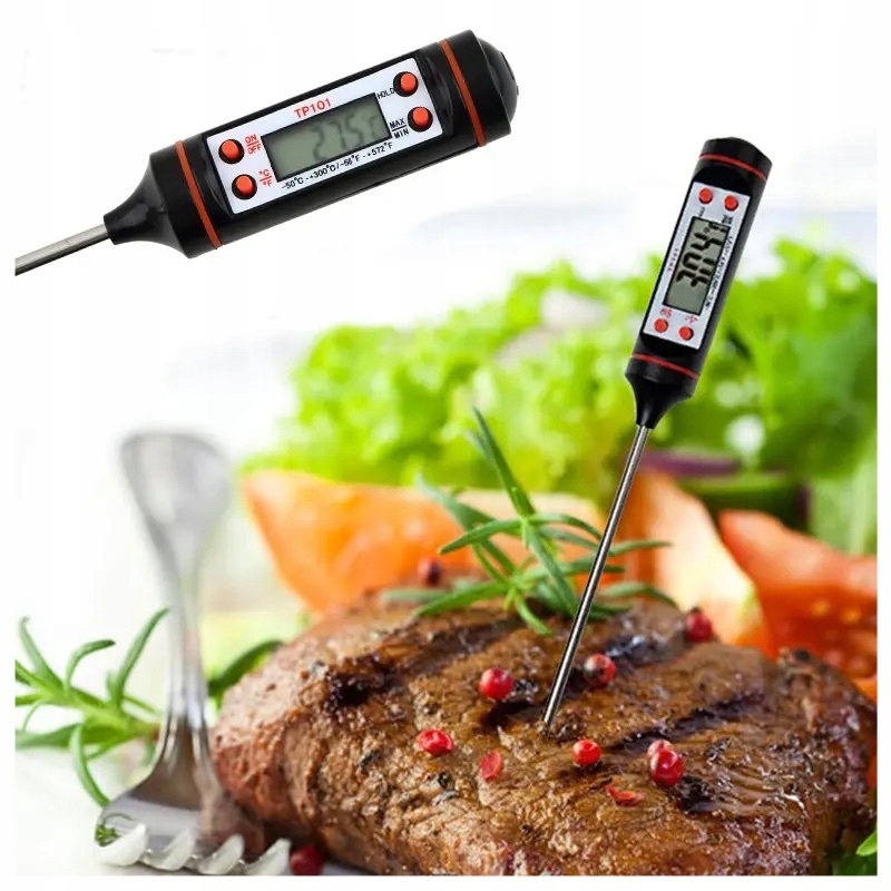 TERMOMETR KUCHENNY CYFROWY DO MIĘSA WINA LCD SONDADlaczego warto kupić nasz produkt ?✅ Niezbędny w kuchni, tam gdzie kluczowa jest temperatura✅ Idealny do mierzenia temperatury mięsa, ciasta, mleka, herbaty, wody, itp.✅ Możliwość odczytania temperatury w stopniach Celsjusza lub Fahrenheita✅ Długa igła ze stali nierdzewnej zakończona czujnikiem temperatury✅ Czytelny wyświetlacz LCD NIEZASTĄPIONY GADŻET W KAŻDEJ KUCHNITermometr elektryczny bezprzewodowy, to idealne urządzenie do mierzenia temperatur różnego rodzaju potraw.Idealnie sprawdzi się podczas: gotowania, grillowania, przygotowywania posiłków dla dzieci, pieczenia, smażenia, wędzenia.Termometr, jest poręczny i ma niewielkie rozmiary, dlatego możesz zabrać je wszędzie ze sobą.Wszędzie tam gdzie ważna jest temperatura SPECYFIKACJAwyświetla zapamiętane min. i max. wyniki pomiaruautomatyczne wyłączenie po 10 minutachzakres temperatur: -50°C do +300°C (-58°F do 572°F)tolerancja: +/-1°Cdokładność: do 0,5°Czasilanie: 1 x 1,5V LR44długość całkowita: 23,5 cmdługość szpikulca: 14,7 cmśrednica szpikulca: 4 mm