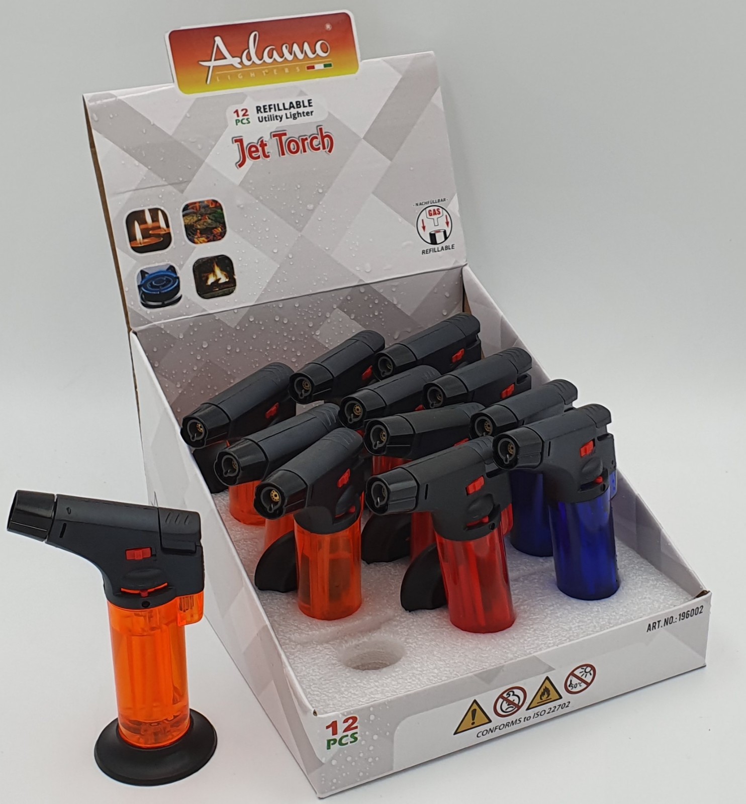 Opis:Wielofunkcyjny palnik gazowy z podstawką dający płomień typu JET FLAME i osiągający temperaturę pracy do 1300 stopni Celsjusza.Pomocny przy drobnym lutowaniu, w pszczelarstwie – przy odpalaniu podkurzacza a także grilla, kominka itp.Dane techniczne:Wysokość palnika – 11cmZapłon piezoelektryczny (przycisk)Blokada przed przypadkowym użyciemMożliwość uzupełnienia gazu (zawór do uzupełniania gazem do zapalniczek) Możliwość regulacji siły płomienia: płomień regulowany suwakiem, – można regulować w trakcie pracy..Przezroczysty pojemnik z gazem, umożliwiający kontrolę poziomu gazuDodatkowa podstawka, którą można błyskawicznie zamontowaćPalnik napełniony gazem, gotowy do pracy.
