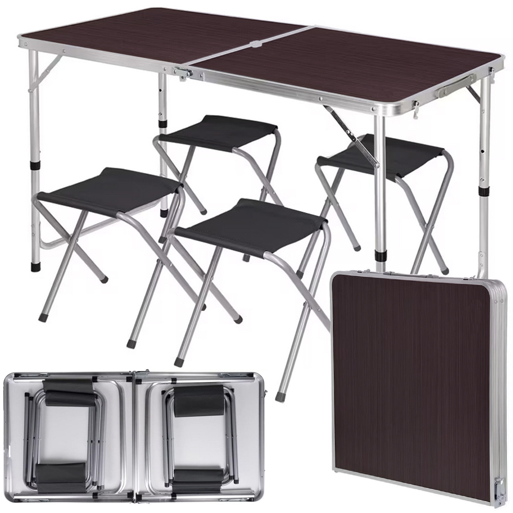 ZESTAW STOLIK STÓŁ TURYSTYCZNY SKŁADANY KEMPINGOWY DUŻY 4 KRZESŁA WALIZKASkładany stolik turystyczny ma aluminiową ramę, co zapewnia lekkość i wytrzymałość. Na ramie znajduje się blat wykonany z trwałego i łatwego w czyszczeniu tworzywa sztucznego. Stolik turystyczny składany może być wykorzystywany w różnych sytuacjach, takich jak piknik, kemping, imprezy plenerowe, czy podczas grilla ze znajomymi. Jest to również idealny wybór do użytku w ogródku, na tarasie czy na balkonie.Zestaw stolik turystyczny z krzesełkami jest bardzo łatwy w użyciu. Można go szybko złożyć i rozłożyć, dzięki czemu jest bardzo praktyczny w podróży. Po złożeniu zajmuje niewiele miejsca, co ułatwia jego przechowywanie i transport.Stolik ma regulowaną wysokość nóg, co sprawia że można go dopasować do indywidualnych potrzeb.Cały zestaw składa się do jednej zamykanej walizki, którą można przenosić dzięki mocnej rączce.Po rozłożeniu stolika, można zamocować w blacie parasol o średnicy rurki około 2,5cm✅ Wysoka jakość wykonania✅ Na kemping✅ Stabilny✅ Wytrzymały✅ Składany✅ Regulowana wysokość✅ Antypoślizgowe nóżki✅ Miejsce na parasol✅ Grubość rurki: 1,5cm✅ Waga zestawu: 6,7kg✅ Kolor blatu stolika: ciemny brąz✅ Kolor siedziska krzesełek: czarnyWYMIARY STOŁU:✅ Szerokość: 60cm✅ Długość: 120cm✅ Wysokość regulowana: 55cm, 62cm, 70cmWYMIARY KRZESEŁKA:✅ Wysokość: 36cm✅ Szerokość: 33cm✅ Szerokość materiału: 22cm